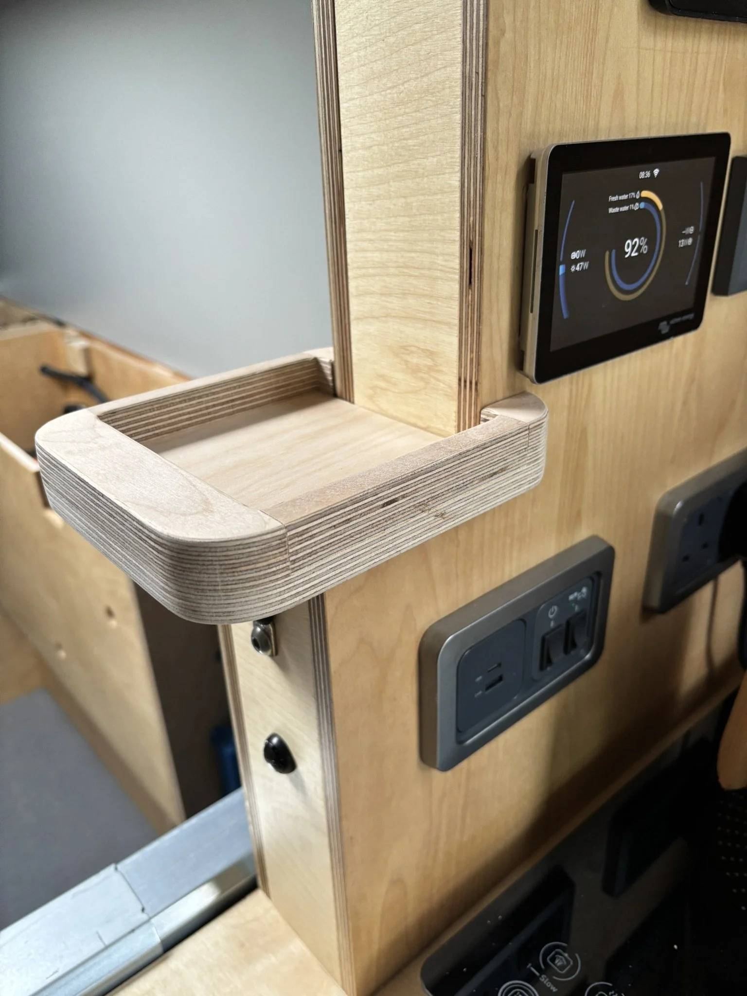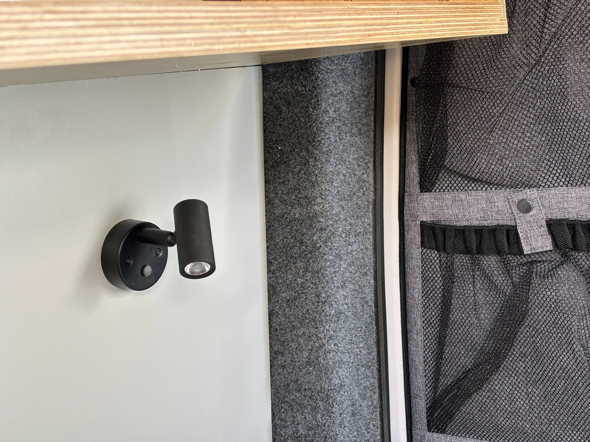 Bed bases cut strip some weight and to support the Froli bad base system. Door frame carpeted. Wall panels installed with bed light. Bed cubbies made in installed with wireless phone chargers