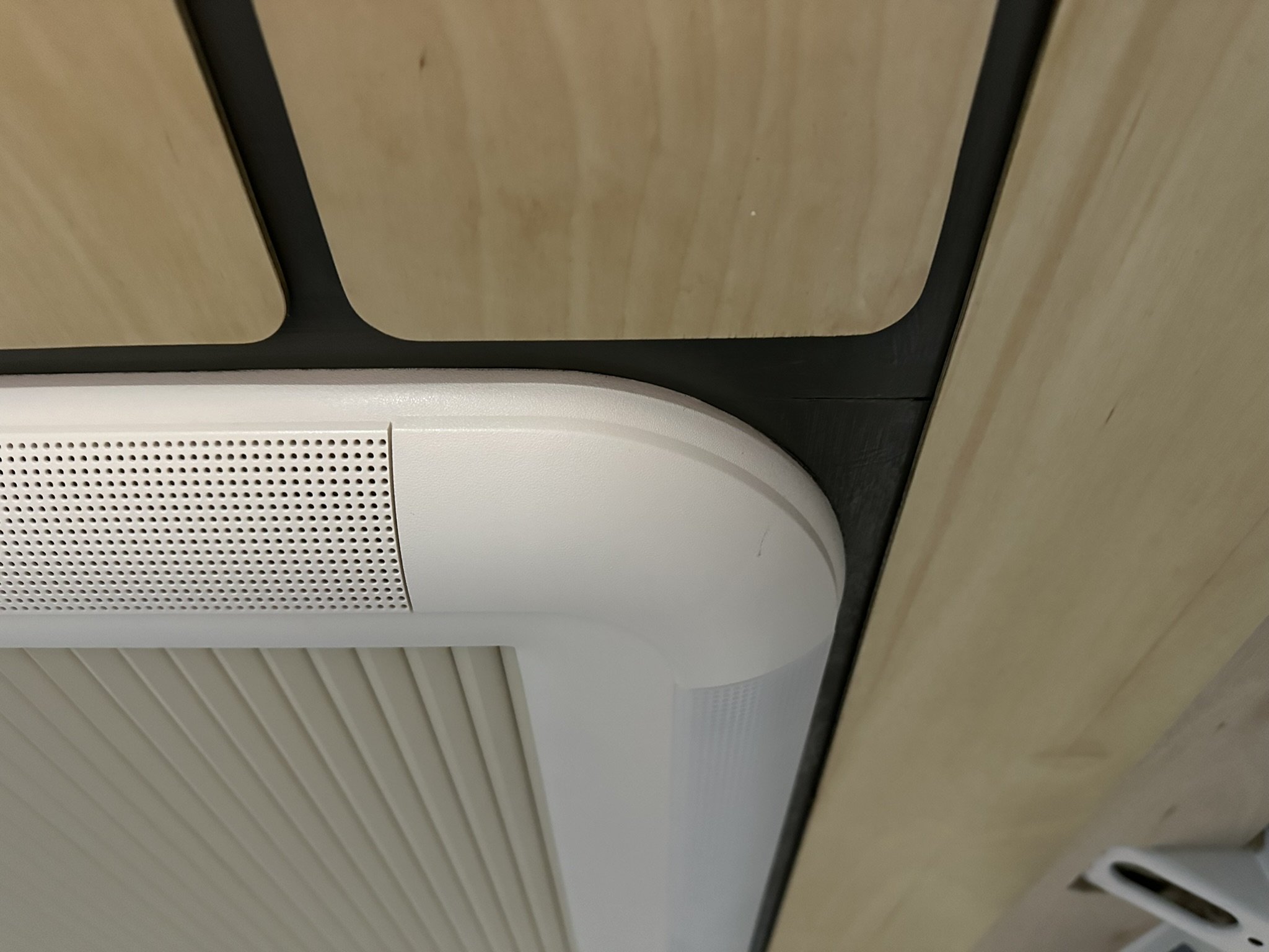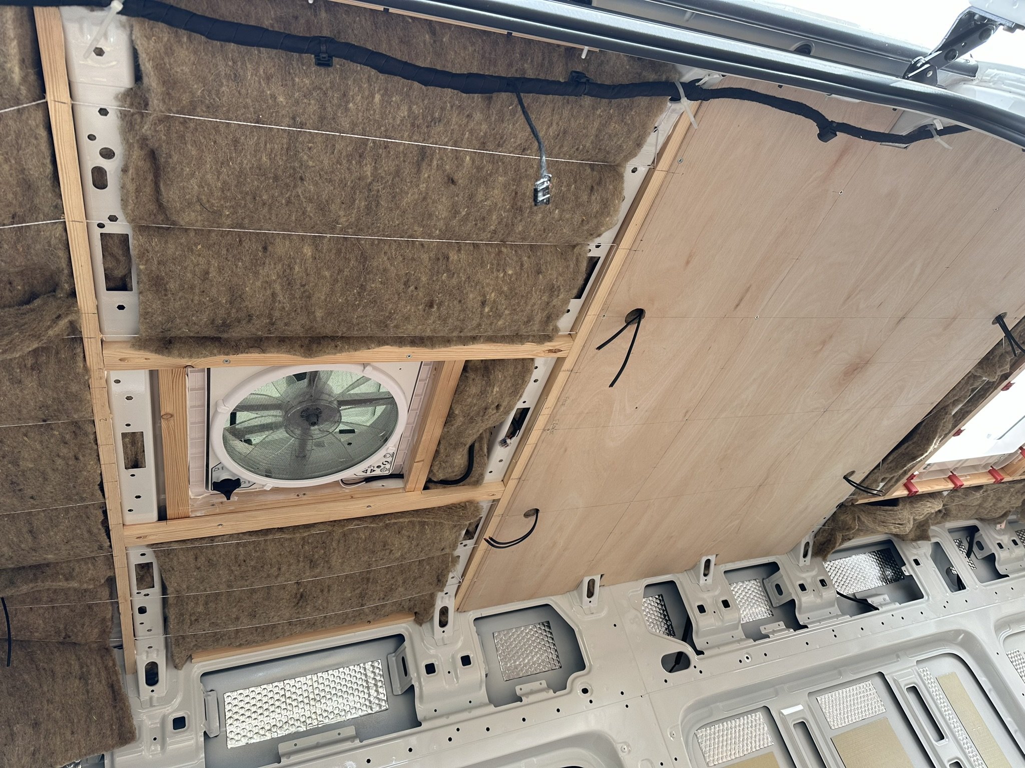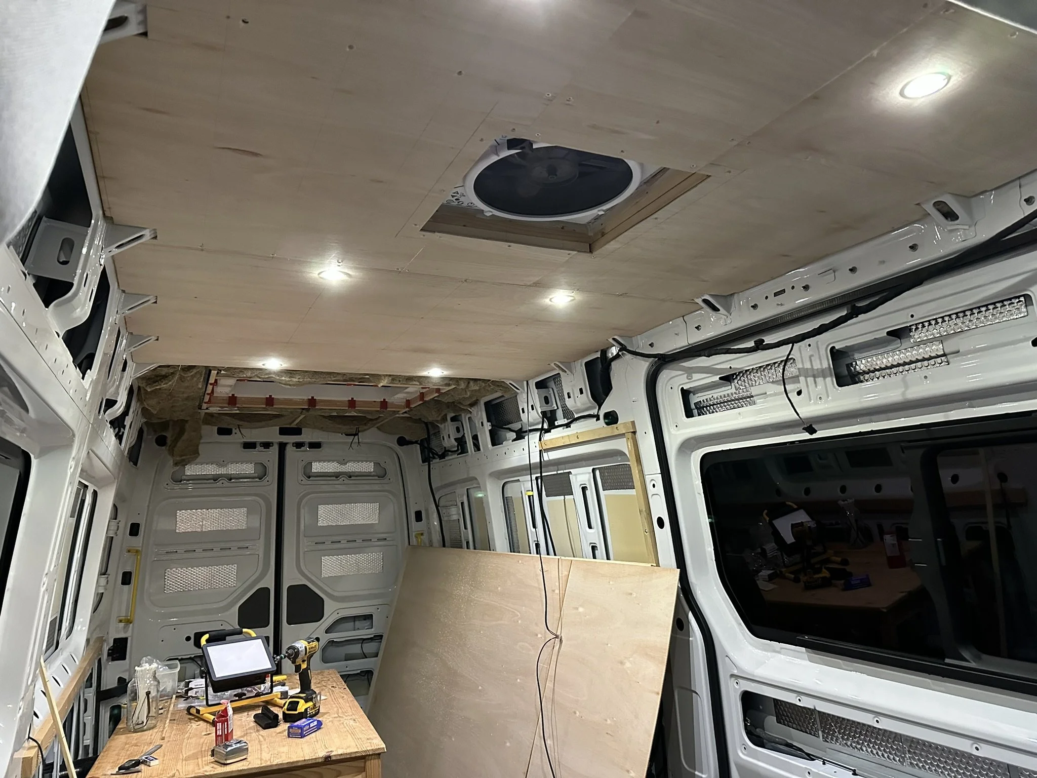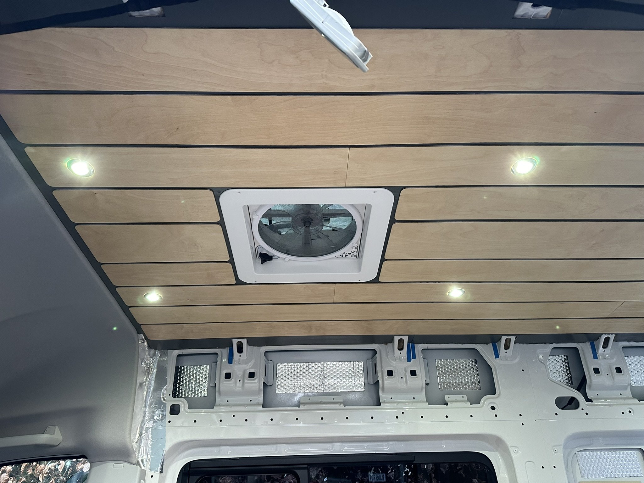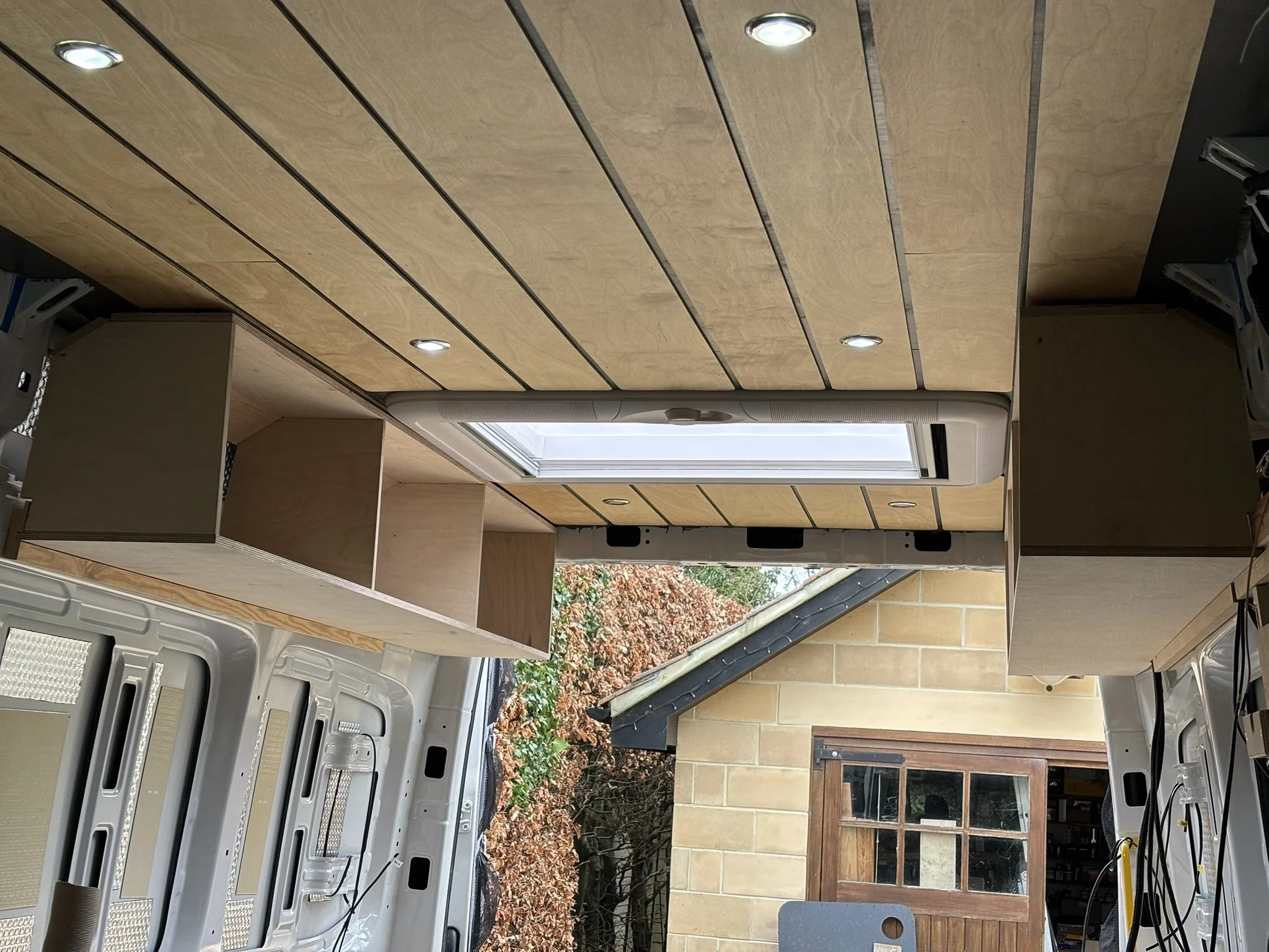 Ceiling is 3mm construction ply base with 3mm birch ply “planks”