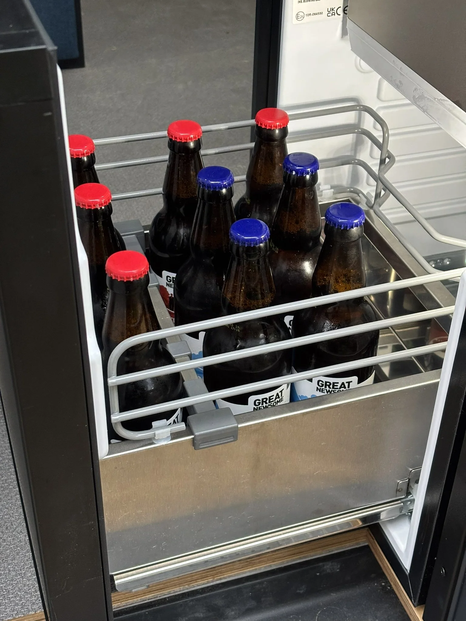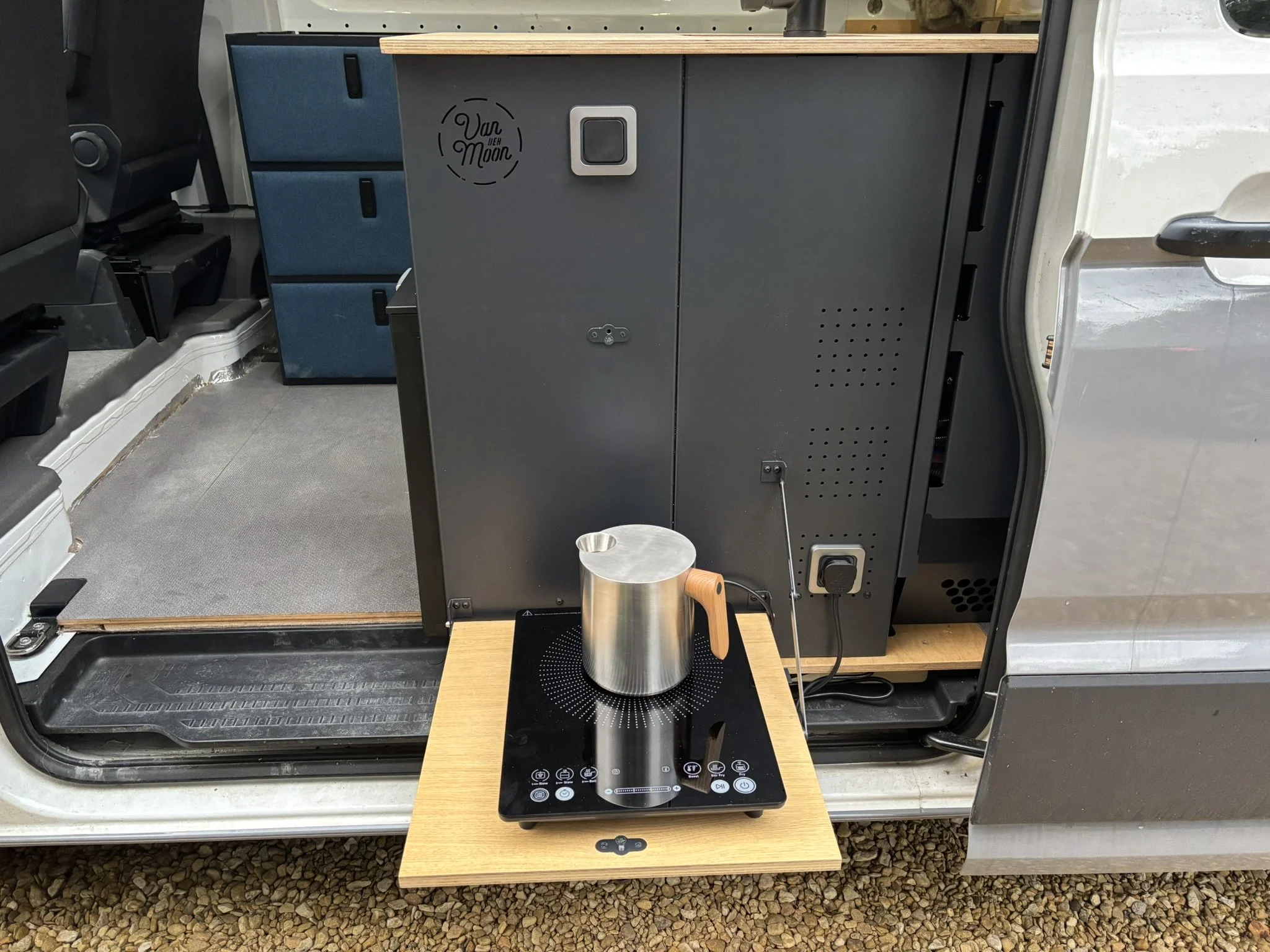 The kitchen is from a company called VanDerMoon in Poland. It’s aluminum, light and saved weeks of construction. Drawer fridge. Cooking will be on mobile induction hobs that can be use in side or outside the van