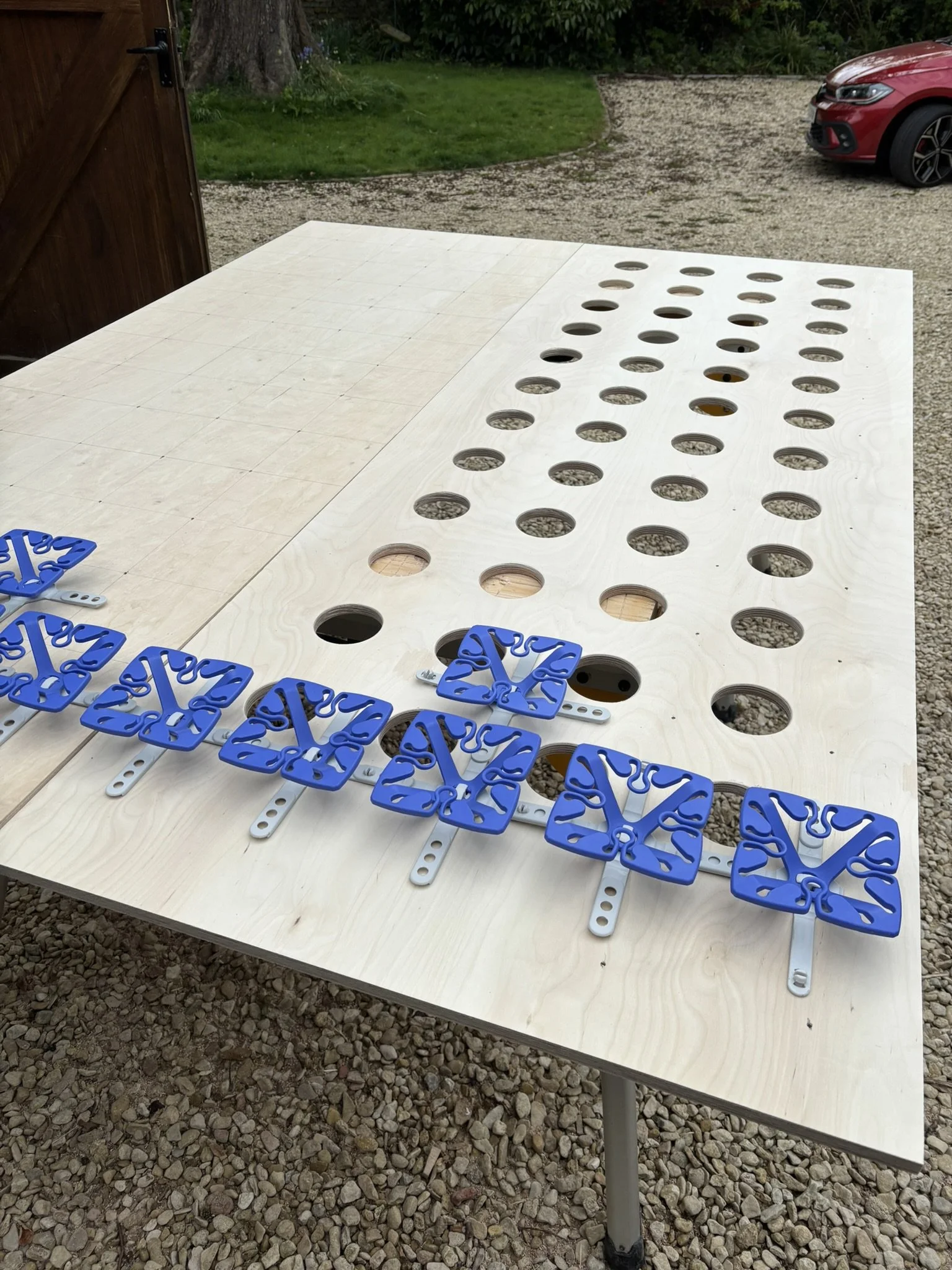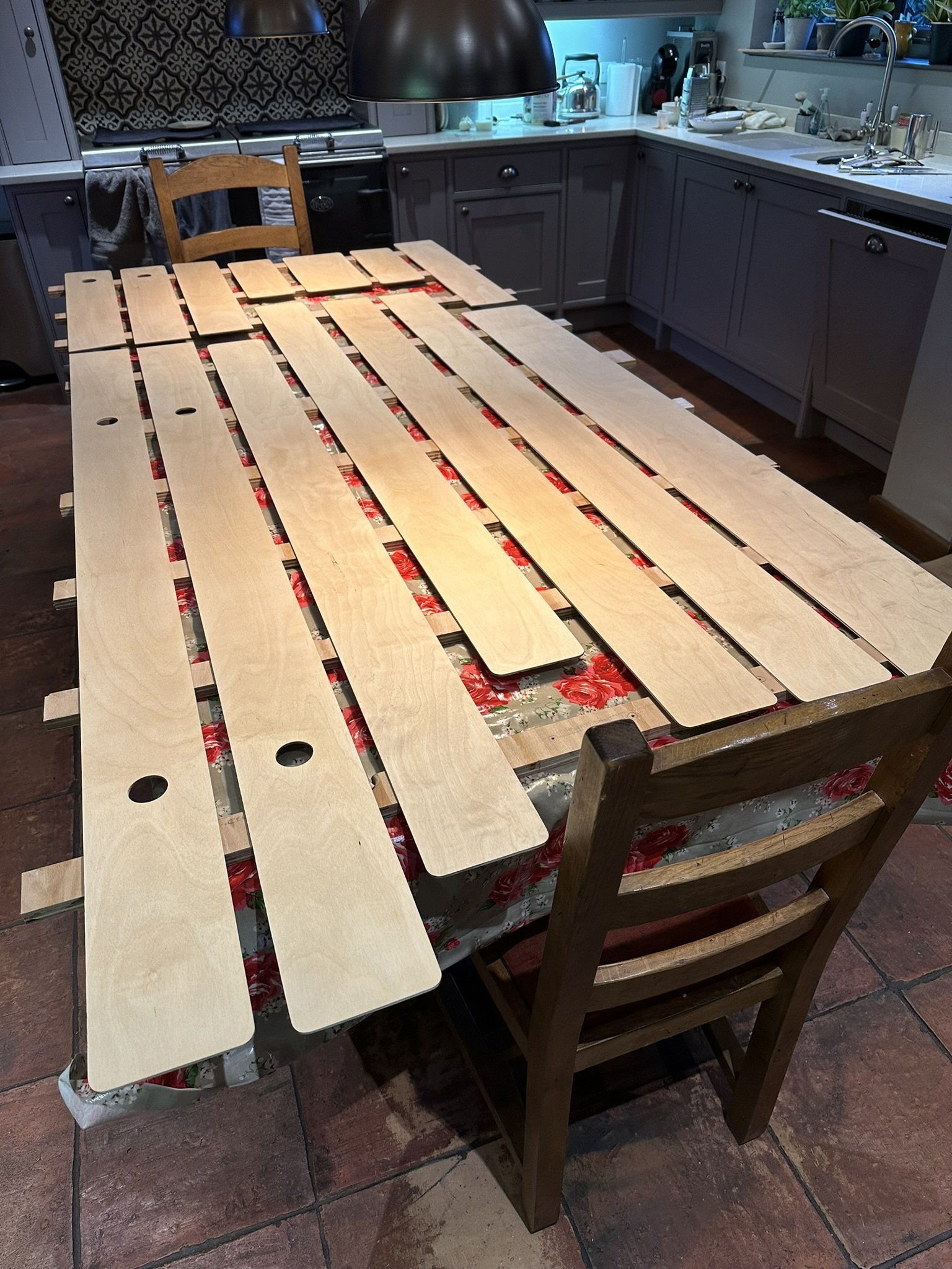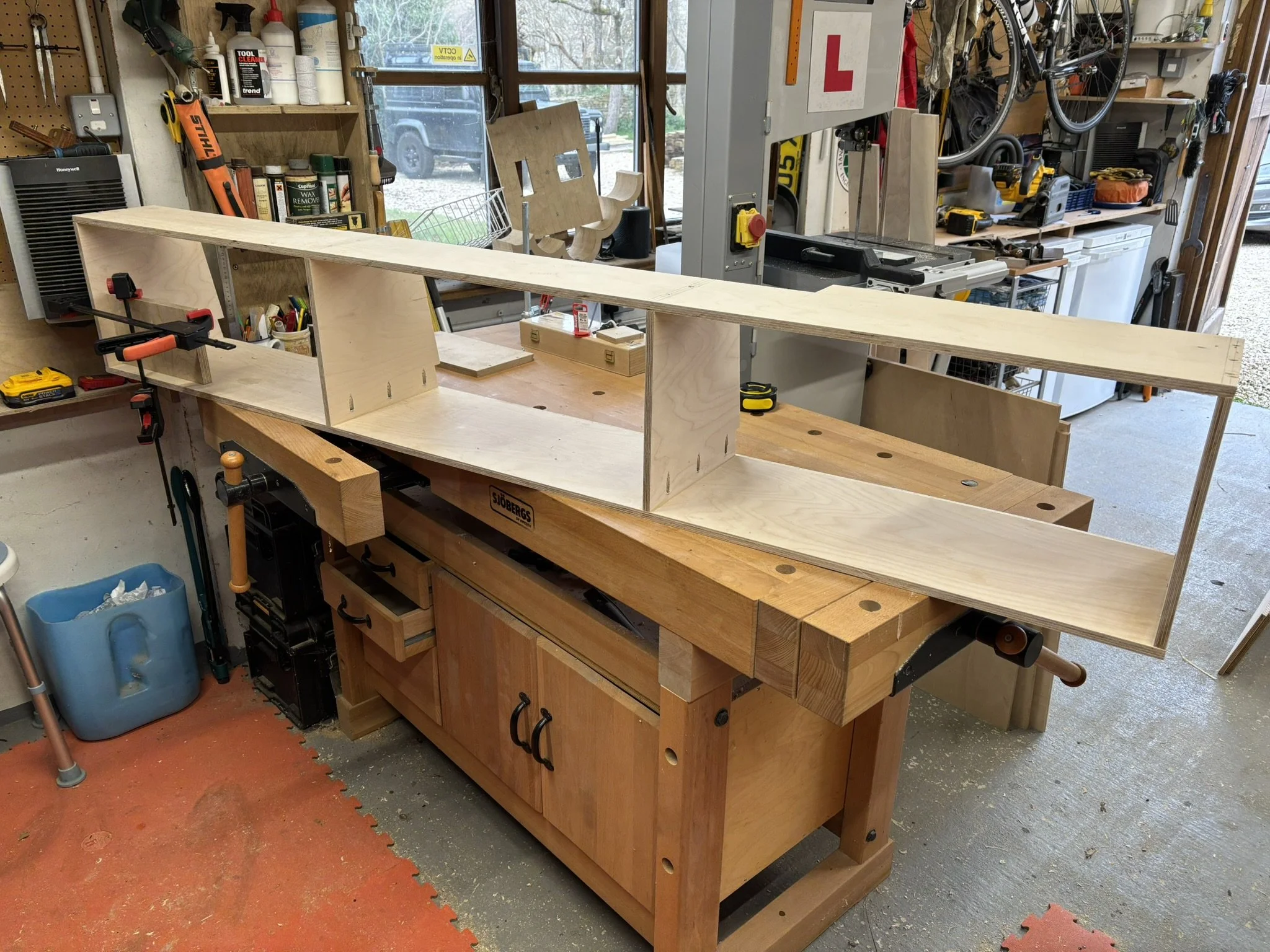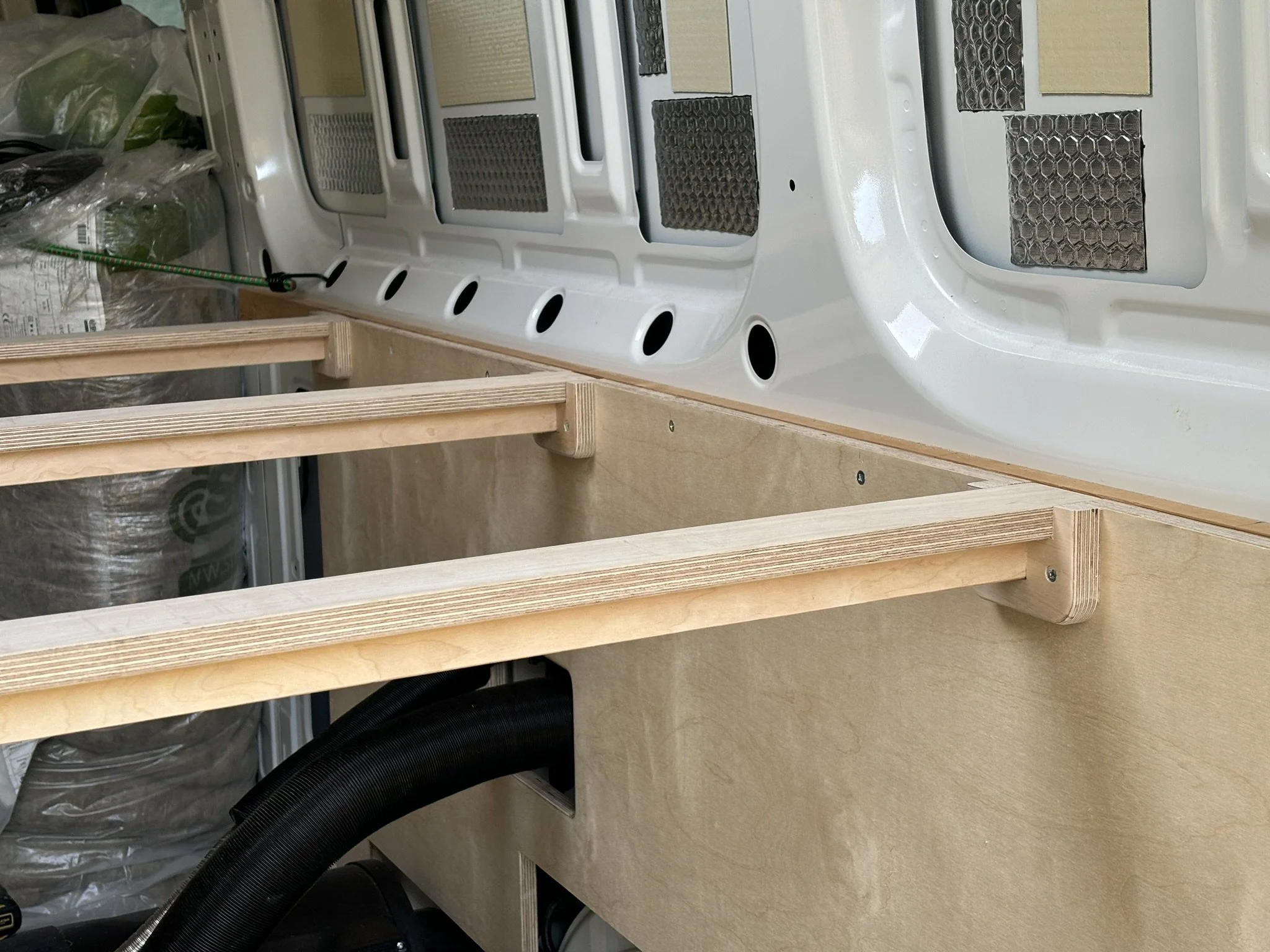 Bed beams made from 18mm ply. Hours of work and fettling only to realise that the old Ikea bed frame hack would be much better. Hey ho